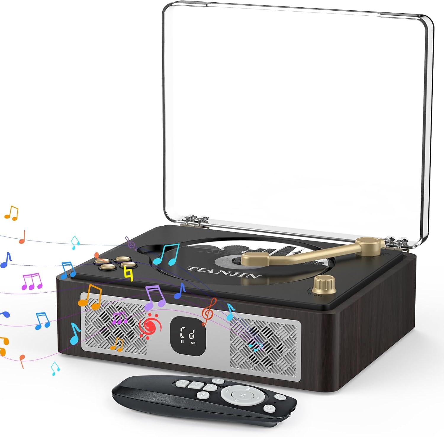 - Retro-Modern Design – Wooden retro finish with golden tonearm adds vintage elegance to any room.
