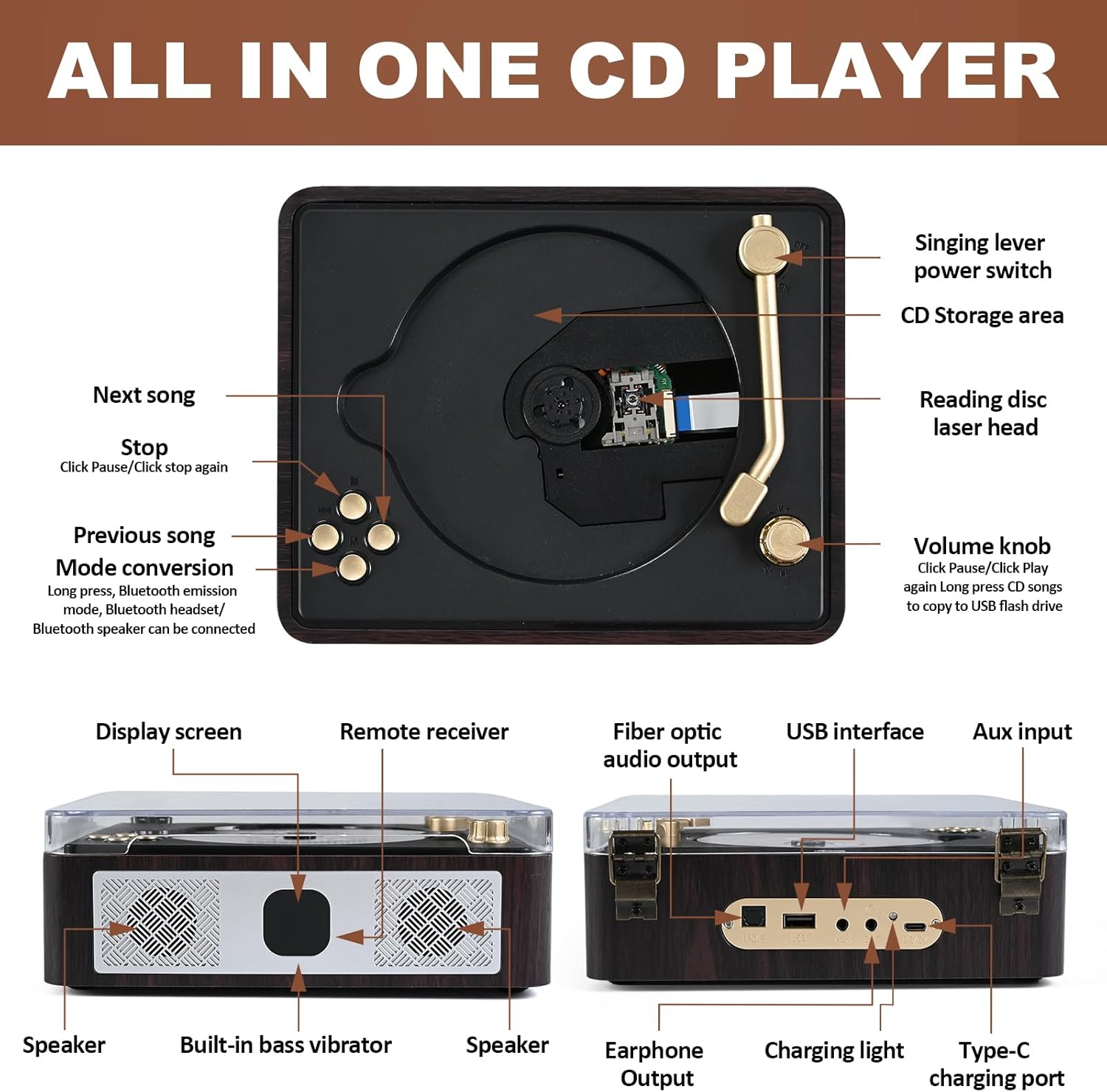 - Multi-Functional Playback – Play CD, CD-R, CD-RW, MP3, WMA. USB input, optical audio output, and headphone jack included for versatile music options.